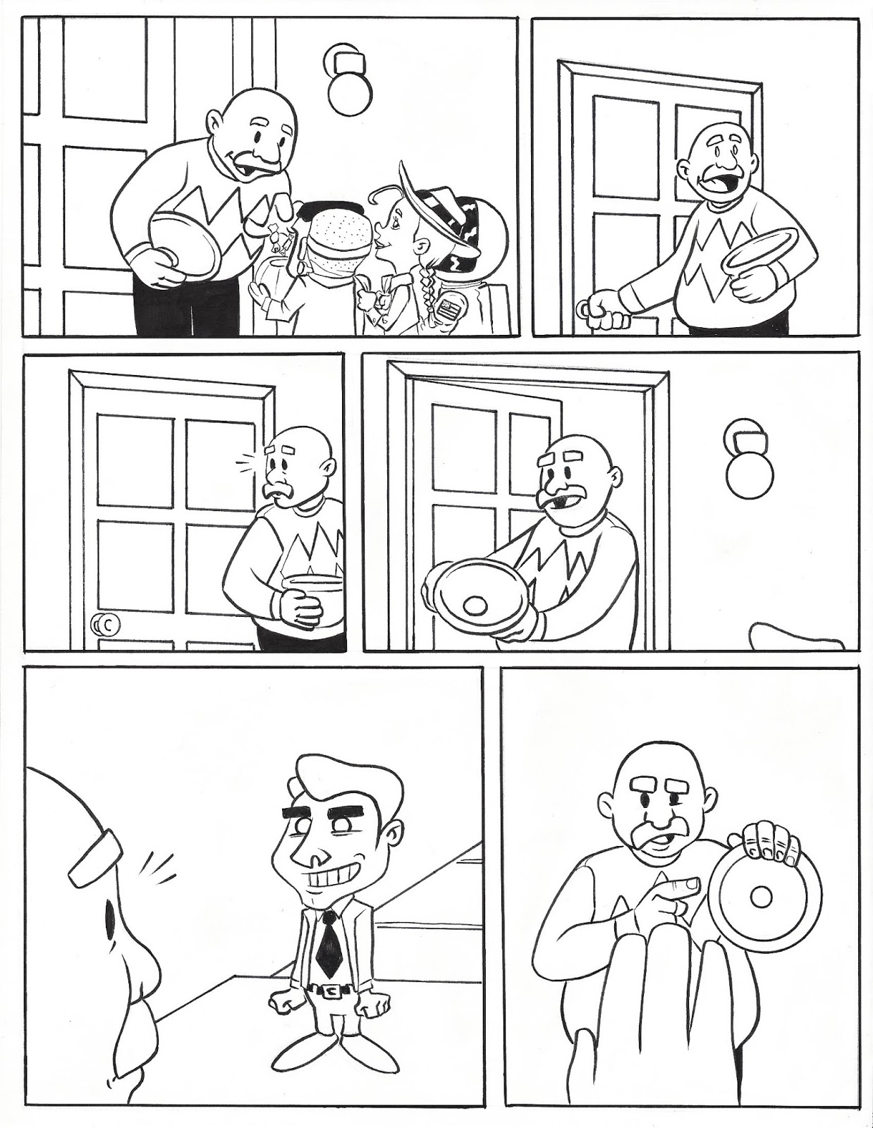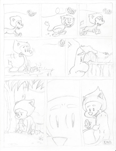 2. I really wanted this to have an animated look to it, so I decided early on that only the two characters would have black outlines, with all of the backgrounds having a painted look to them. I decided the best way to do this was to fully pencil the pages, scan them to Photoshop and do the rest (inking and coloring) digitally. In hind-sight, there's probably a better way to do it, but what can you do...