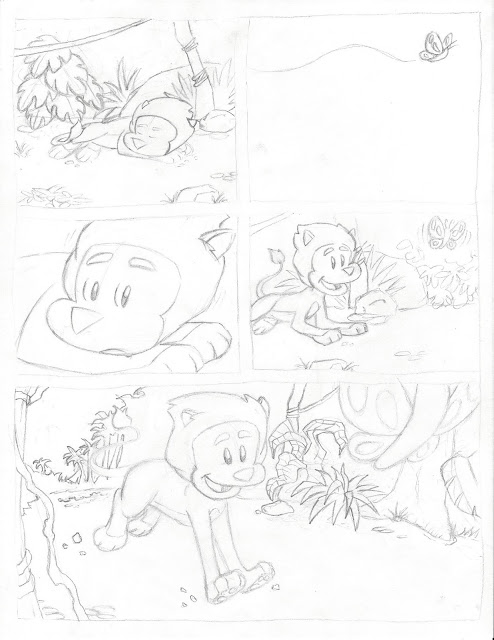 1. The lion would go through a few different emotional changes (asleep/neutral to happy on Page 1, and then from happy to scared/surprised to sad and finally back to happy on Page 2). It was important to me that each reaction came across clearly since there would be no dialogue and the only character that can show emotion between the two is the lion. I think I did alright on this one.